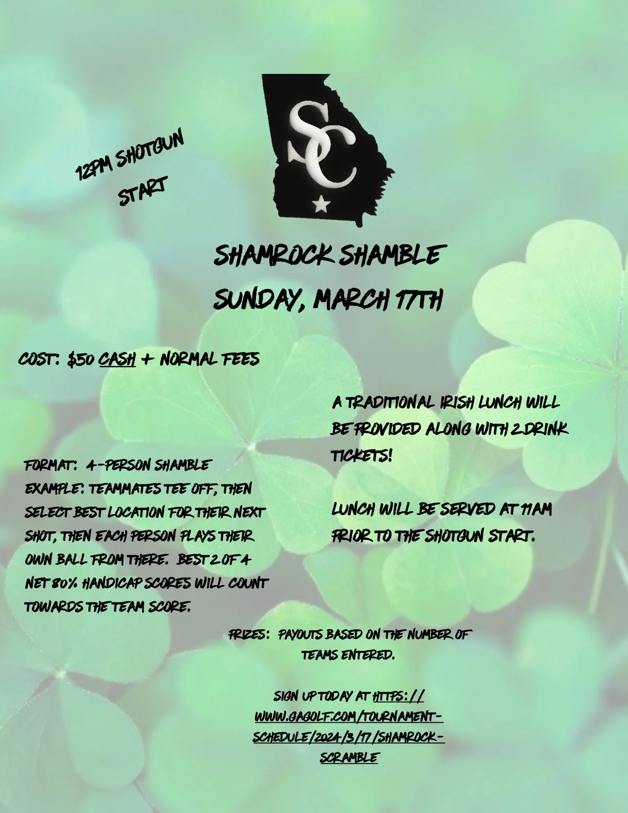 Format: 4-Person Shamble (Teammates tee off, then select best location for their next shot, then each person plays their own ball from there. Best 2 of 4 Net 80% Handicap Scores will count towards the team score.